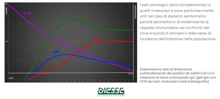 La scelta dell’antigene nativo è dettata dal fatto che il SARS-CoV-2 è un virus “nuovo” per cui l’uso del virione “intero” consente di determinare anticorpi diretti contro tutte le proteine virali, anche nel loro stato conformazionale naturale. I test molecolari sono sensibili nelle fasi iniziali dell’infezione da SARS-CoV-2, con un tasso di positività maggiore del 90% entro i primi tre giorni dall’inizio di sintomi, per poi declinare al di sotto dell’80% al sesto giorno e giungere al di sotto del 50% dopo 14 giorni. In particolare, la sensibilità dei test molecolari è superiore a quelli sierologici se eseguiti entro 5,5 giorni dall’esordio dei sintomi, mentre successivamente la determinazione delle IgM e delle IgA risulta più sensibile. Nei pazienti asintomatici, la metodica molecolare eseguita da sola ha una sensibilità del 52%, ma la simultanea determinazione delle IgM ed IgA fa innalzare il livello ad oltre il 96%.