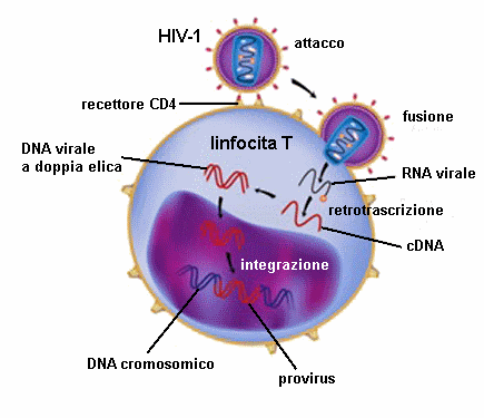 della Sindrome da Immuno Deficienza Acquisita (AIDS, Acquired Immuno Deficiency Syndrome). L’HIV è suddiviso in due ceppi: HIV-1 localizzato prevalentemente in Europa, America , Asia e Africa centrale e HIV-2 confinato in Africa occidentale che determina una sindrome clinicamente più moderata rispetto al ceppo 1. L’HIV è un retrovirus (virus a RNA) appartenente ai lentivirus che sono caratterizzati dall’avere un tempo di incubazione molto lungo. Il genoma di HIV-1 presenta un’ampia variabilità genetica che ha portato a classificarlo in tre gruppi: il gruppo M (Major) che a sua volta e suddiviso in 12 sottotipi (A,B,C,D,F,G,H,J,K,AB,AE,AG), gruppo N e gruppo O. Il virus si trasmette per via sessuale (secrezioni vaginali, sperma, sangue), ematica mediante contatto con sangue e/o emoderivati infetti, verticale da madre a figlio durante la gravidanza, parto o allattamento. Dopo l’infezione il virus entrato nel circolo sanguigno, va alla ricerca di particolari cellule in cui replicarsi; in particolare attacca i linfociti T CD4+, cellule del sistema immunitario (Fig.1). Una volta all’interno l’RNA virale viene convertito in DNA che si integra nel genoma della cellula ospite (provirus). A questo punto l’HIV può restare inattivo all’interno della cellule o iniziare il processo replicativo che porta alla formazione di nuove particelle virali che vengono espulse dalla cellula, provocandone la distruzione, e liberate nel circolo sanguigno, pronte ad infettare nuove cellule T CD4+. L’infezione acuta della durata di 1-2 settimane generalmente ha un quadro clinico poco specifico, simil-influenzale. Al termine della fase acuta i sintomi scompaiono e inizia la lenta risposta immunitaria da parte dell’organismo, che può durare 2-8 settimane, con la produzione di anticorpi (sieropositività). In assenza di terapia, la fase di latenza (o cronica) può durare per molti anni e sebbene le condizioni cliniche del paziente sieropositivo siano stabili, il sistema linfatico subisce un progressivo deterioramento, poiché la replicazione virale persiste e i linfociti T CD4+ distrutti non vengono adeguatamente rimpiazzati. Quando il loro numero scende al di sotto della soglia critica (200/ml) l’organismo non è più in grado difendersi da “infezioni opportunistiche”, causate da microorganismi (batteri, funghi, virus, protozoi) normalmente scarsamente patogeni che, in condizione di bassissimi livelli di linfociti T CD4+, possono provacare patologie polmonari, gastro-intestinali, oculari e cerebrali con gravi manifestazioni cliniche (AIDS conclamato). Attualmente il trattamento terapeutico è a base di farmaci anti-retrovirali che non permettono di eliminare il virus ma ne limitano la proliferazione, contenendo la distruzione di cellule T CD4+.